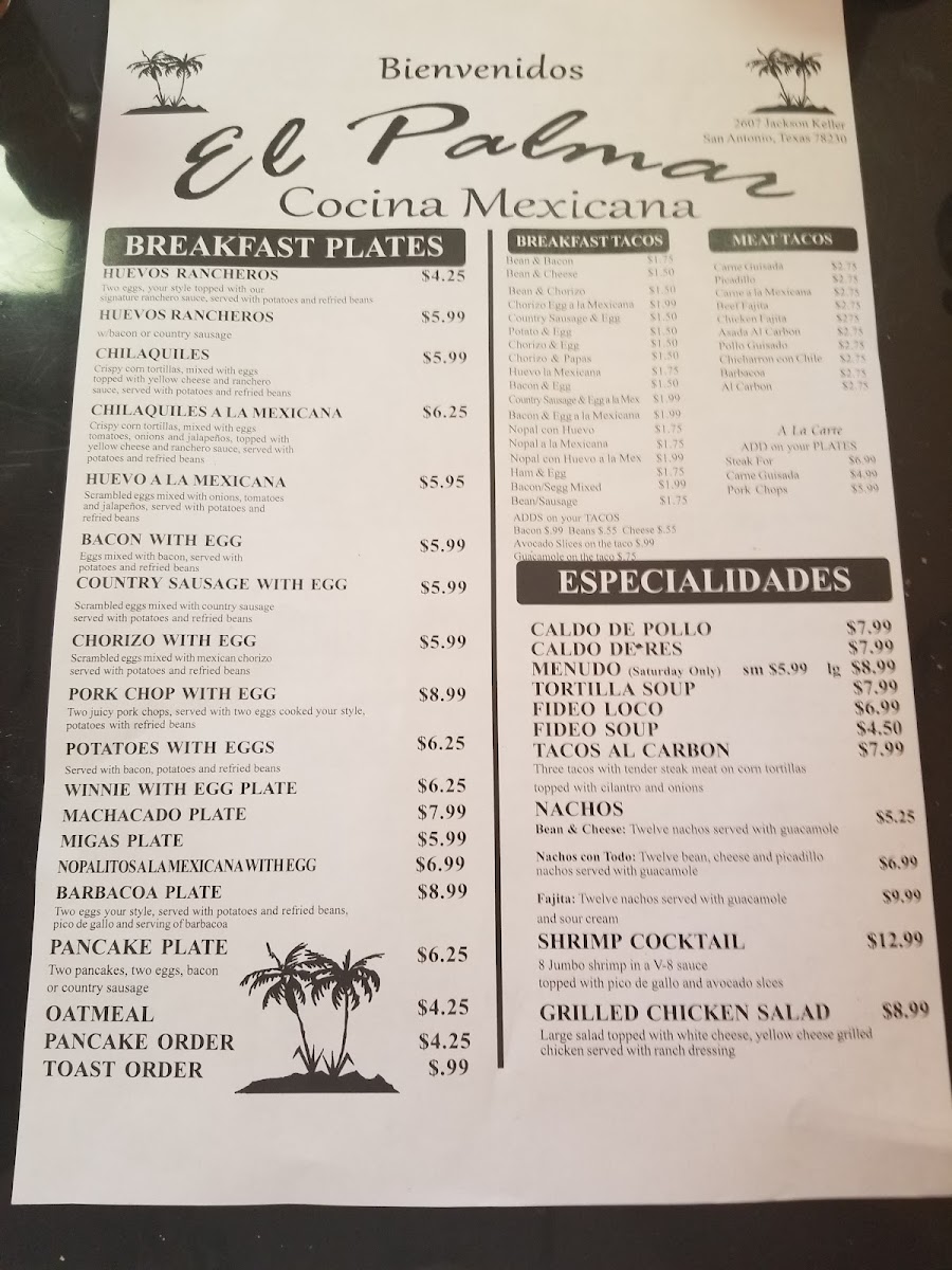 “ El Palmar is solid breakfast joint serving Tex-Mex breakfast with some traditional or American breakfast items. The prices are great and the amount of food is plentiful. The staff is very friendly and the coffee is always hot! Today, I had my usual Chilaquiles a la Mexicana with a side Barbacoa taco. Two flour tortillas were included with the plate. Five of us had breakfast plates and the total was around 45. Hope this review helps. ”
